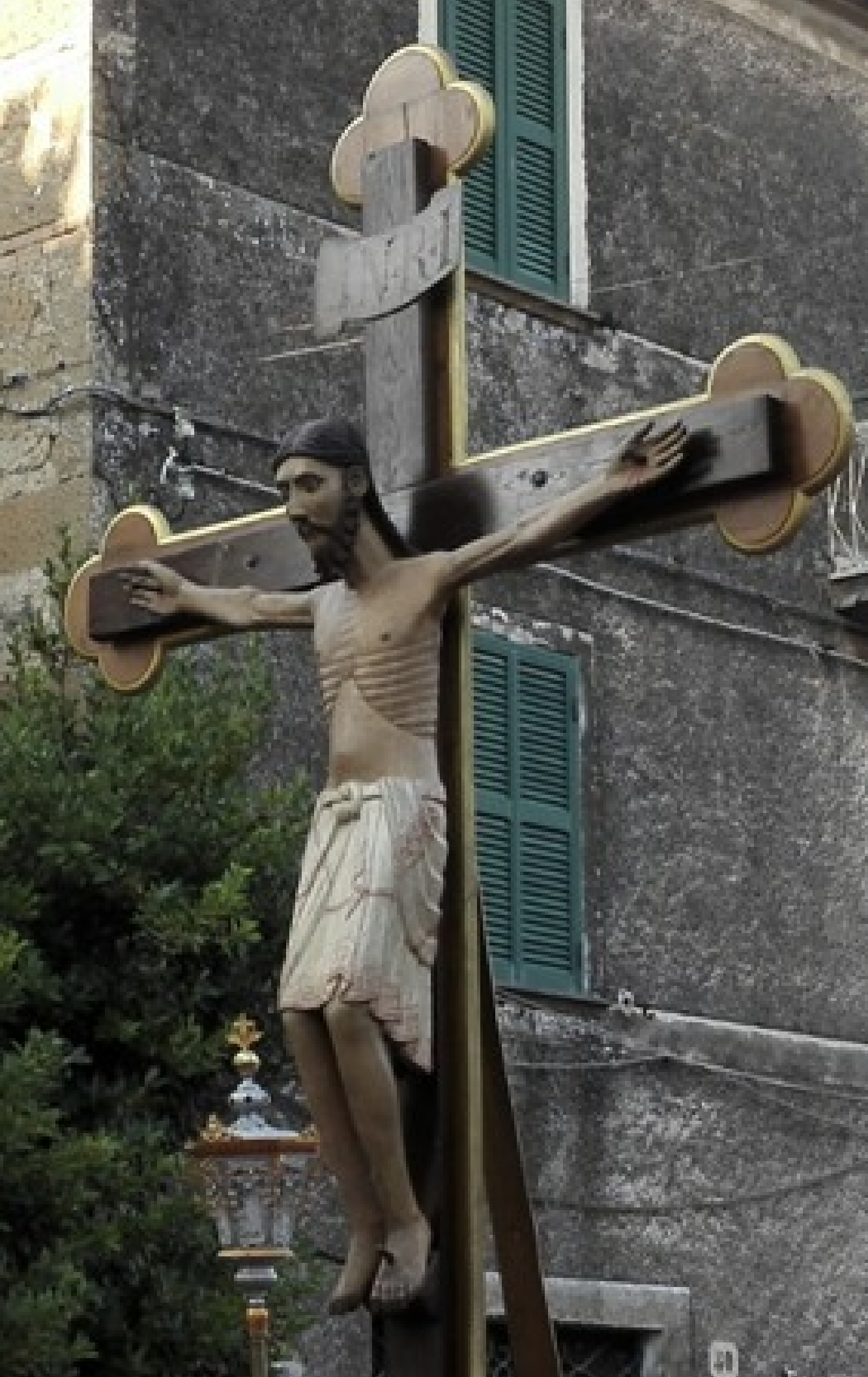 A religious cross with a person on it Description automatically generated